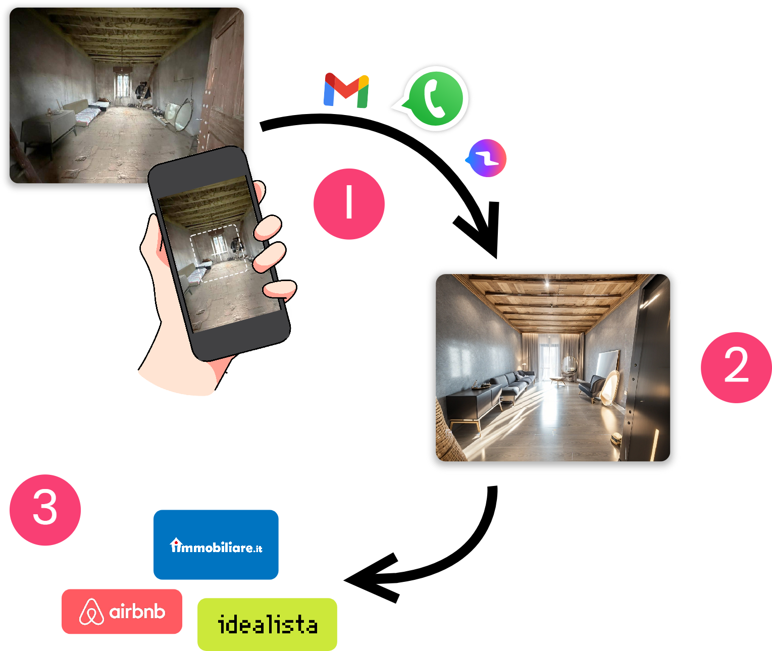 Inviaci le foto della tua proprietà dal tuo smartphone e noi facciamo tutto il resto, e bada bene: non serve comprare mobili o usare cartonati costosi come nell'home staging classico. Con il nostro servizio di Virtual Staging, lavoriamo sulle tue foto e le trasformiamo in immagini realistiche e dettagliate, rendendo l'immobile più accogliente e attraente per i potenziali acquirenti.